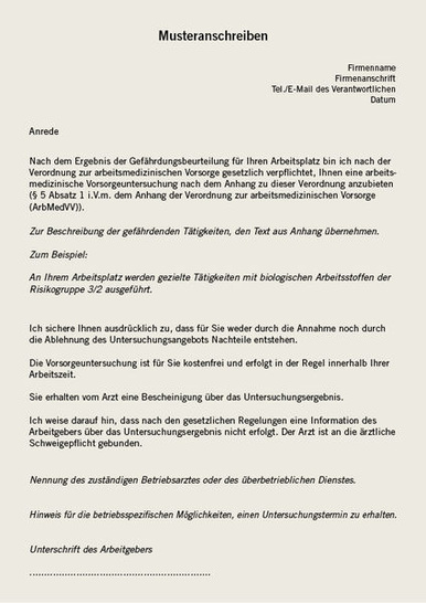 - 2. die Mitteilung, aufgrund welcher Gefährdung bzw. welcher Gefährdungen das Angebot für eine Vorsorgeuntersuchung gemacht wird; sie kann ggf. durch einen Auszug aus der Gefährdungsbeurteilung ergänzt werden;