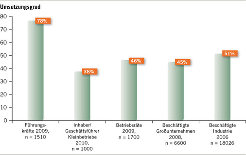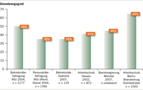 Trotz der hohen Unsicherheit, die in den Daten der beiden Synopsen liegt, wird doch offensichtlich, dass auch nach fast zwei Jahrzehnten der Umsetzungsstand der GFB unbefriedigend ist und dass viele Führungskräfte die GFB nur als notwendiges Übel und nicht als einen Weg hin zu Best-Practice-Lösungen der Arbeitsgestaltung und Arbeitsorganisation begreifen. Es sei deshalb auf die zahlreichen Umsetzungshilfen hingewiesen, die mittlerweile auch in praxisgerechter Form vorliegen.