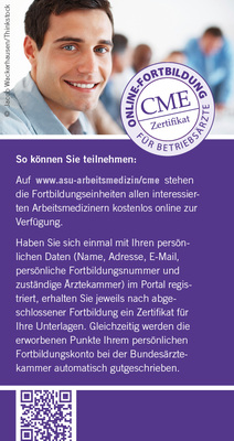 In einem Gemeinschaftsprojekt mit der ias Aktiengesellschaft, die die finanzielle Förderung des deutschen CME-Projekts übernahm, wurden am Institut und Poliklinik für Arbeits-, Sozial- und Umweltmedizin des Klinikums der Universität München (LMU) bisher 12 CME-Fälle erstellt. Die Lernfälle bestehen jeweils aus 7 bis 10 interaktiven Lernkarten mit einer Rahmenhandlung aus dem arbeitsmedizinischen Alltag, Hinter-grundinformationen, Hyperlinks und Fragen, die zur Überprüfung der eigenen Kenntnisse dienen und zum Mitdenken anregen sollen. Im Anschluss an die Darstellung des Themas folgen jeweils 10 CME-Fragen, mit denen – je nach Anzahl der richtig be-antworteten Fragen – drei CME-Punkte erworben und dem persönlichen Fortbildungskonto gutgeschrieben werden kann. Die Lerneinheiten werden von der Bayerischen Landesärztekammer zertifiziert.