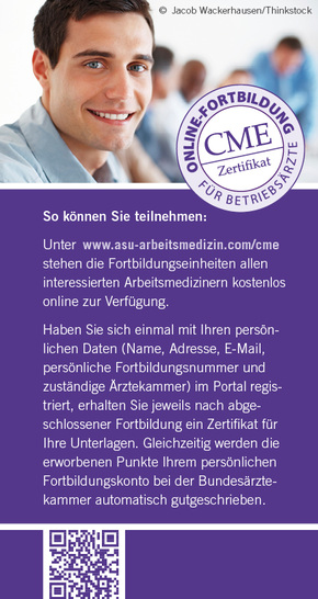 Seit April diesen Jahres unterstützt ASU Sie regelmäßig bei Ihrer bestehenden Fortbildungsverpflichtung mit Themen aus der Arbeitsmedizin, die im Unterschied zu herkömmlichen zeitschriftengebundenen Angeboten mit interaktivem Lernen auf einer eigens eingerichteten Plattform im Internet verknüpft sind. Bei Registrierung im Portal und der Angabe Ihrer individuellen Fortbildungsnummer (EFN) ist auch die automatische Übermittlung der erreichten Punkte auf das persönliche CME-Konto bei der Ärztekammer sichergestellt.