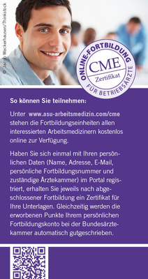In einem Gemeinschaftsprojekt mit der ias Aktiengesellschaft, die die finanzielle För-derung des deutschen CME-Projekts über-nahm, wurden am Institut und Poliklinik für Arbeits-, Sozial- und Umweltmedizin des Klinikums der Universität München (LMU) bisher 12 CME-Fälle erstellt. Die Lernfälle bestehen jeweils aus 7–10 interaktiven Lern-karten mit einer Rahmenhandlung aus dem arbeitsmedizinischen Alltag, Hintergrundinformationen, Hyperlinks und Fragen, die zur Überprüfung der eigenen Kenntnisse dienen und zum Mitdenken anregen sollen. Im Anschluss an die Darstellung des Themas folgen jeweils 10 CME-Fragen, mit denen – je nach Anzahl der richtig beantworteten Fragen – CME-Punkte erworben und dem persönlichen Fortbildungskonto gutgeschrieben werden können. Die Lerneinheiten wurden von der Bayerischen Landesärztekammer zertifiziert.