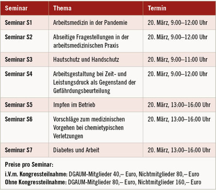 Auch in diesem Jahr bietet die DGAUM wieder am letzten Tag der Jahrestagung zertifizierte Seminare zu verschiedenen Themen aus dem Fachgebiet der Arbeitsmedizin an. Alle Seminare können auch unabhängig von der Kongressteilnahme gebucht werden. Mitglieder der DGAUM erhalten eine Ermäßigung bei der Teilnahmegebühr.