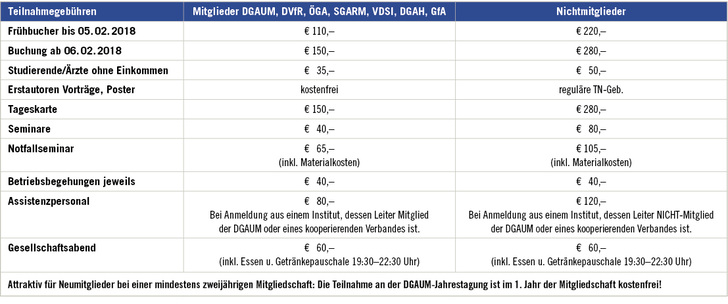 Interessierte können das aktuelle Programm ab dem 1. Dezember 2017 auf der Homepage der DGAUM einsehen und sich dort online als Teilnehmer anmelden ( https://www.dgaum.de/termine/jahrestagung/ ). Für Anmeldungen bis zum 5. Februar 2018 gelten Frühbuchertarife.