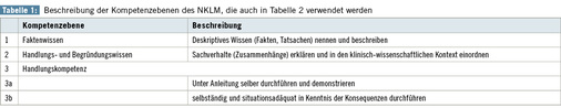 Der NKLM schlägt die in Tabelle 1 zusammengestellten Kompetenzebenen vor, diese wurden von der Arbeitsgruppe der DGAUM übernommen. In Anlehnung an den NKLM werden für die Arbeitsmedizin die in Tabelle 2 dargestellten übergeordneten Lernziele zur Diskussion gestellt.