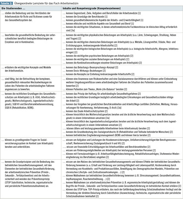 - der Vermittlung von Kenntnissen, Fähig-keiten und Fertigkeiten zum Erkennen arbeitsbedingter Einflüsse auf die Gesundheit, zur Beurteilung der physischen und psychomentalen Leistungsfähigkeit leistungsgeminderter Erwerbstätiger und deren beruflicher Rehabilitation entspre-chend den konkreten Arbeitsanforderun-gen;