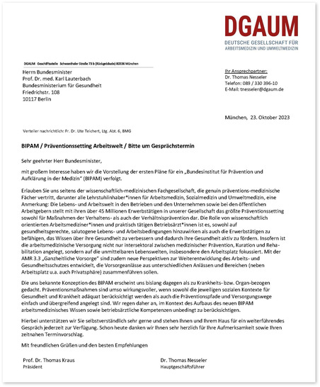 Die bisher bekannte Konzeption des neuen Bundesinstituts für Prävention und Aufklärung in der Medizin (BIPAM) ist zu krankheits- und organbezogen. Es braucht den Blick auf gesamtgesellschaftlich relevante Präventionssettings, wie etwa die Arbeitswelten. In einem Brief an Bundesgesundheitsminister Karl Lauterbach mahnt die DGAUM an, arbeitsmedizinisches Wissen und betriebsärztliche Expertise unbedingt zu berücksichtigen:
