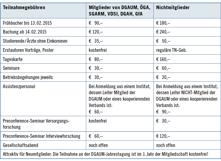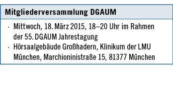 Bei der Jahrestagung in München 2015 wird die DGAUM an den im Jahr 2014 eingeführten Veränderungen und Neuerung festhalten: Die Tagung beginnt bereits am Mittwoch, den 18. März, mit thematischen Foren und der Eröffnungsveranstaltung von 12:00 bis 13:30 Uhr, auf den Samstag wird als Kongresstag verzichtet. Diese Konzentration des Kongress-Programms auf drei Tage ist der allgemein zu beobachtenden Entwicklung geschuldet, dass die Samstage als Kongresstage für Tagungsbesucher zu-nehmend unattraktiv werden. Die vorliegenden Rückmeldungen bei den Kongressgästen und den ausstellenden Industrie-unternehmen haben die Fachgesellschaft in dieser Politik bestätigt.