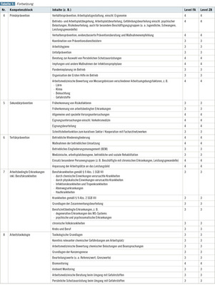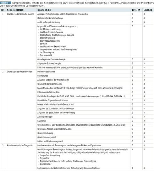 Die Deutsche Gesellschaft für Arbeitsmedizin und Umweltmedizin (DGAUM) hat zur Novellierung der MWBO eine Arbeitsgruppe eingesetzt, die entsprechende Vorschläge erarbeitet hat. Diese wurden auf der internationalen Jahrestagung der DGAUM am 14. März 2013 in Bregenz in einer gesonderten Veranstaltung dem interessierten Fachpublikum vorgestellt, mit diesem diskutiert und weiterentwickelt. Zusätzlich wurden die Inhalte im Rahmen der Mitgliederversammlung mit den Mitgliedern der DGAUM sowie anschließend mit dem Berufsverband – Verband Deutscher Betriebs- und Werksärzte (VDBW) – besprochen. Inzwischen sind Anregungen und Änderungsvorschläge des VDBW berücksichtigt und weitgehend zwischen DGAUM und VDBW konsentiert. Unterschiedliche Auffassungen ergaben sich hauptsächlich bezüglich der Beibehaltung der Zusatzbezeichnung „Betriebsmedizin“, für deren Abschaffung der VDBW plädiert. Ein vollständiger Konsens konnte bezüglich der Umbenennung des Facharztes sowie der Kompetenzblöcke, deren Inhalte und den jeweiligen Kompetenz-Leveln ( Tabelle 1 ) erzielt werden.