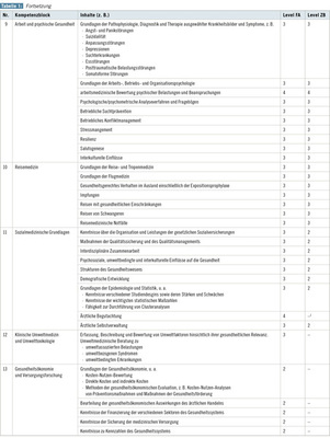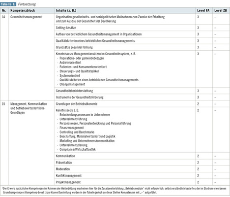 Wesentlicher Unterschied zu den bisherigen Weiterbildungsinhalten sind die Kompetenzblöcke 13 (Gesundheitsökonomie und Versorgungsforschung), 14 (Gesundheitsmanagement) und 15 (Management, Kommunikation und Betriebswirtschaftliche Grundlagen). In diesen Kompetenzblöcken sind Inhalte zusammengefasst, die zunehmend an Bedeutung gewinnen und über die der Facharzt/Fachärztin für „Arbeitsmedizin und Prävention“ zukünftig umfangreichere Kenntnisse und Kompetenzen benötigt. Für die Zusatzbezeichnung „Betriebsmedizin“ erschienen hier Grundkenntnisse, wie sie im Studium erworben werden (daher Kompentenz-Level 1) ausreichend. Ähnliches gilt auch für die klinische Umweltmedizin und Umwelttoxikologie sowie für die arbeitsmedizinische Begutachtung. Für die Zusammenhangsbegutachtung ist bei der Komplexität der Fragestellungen und den gutachterlichen Anforderungen aus Sicht der wissenschaftlichen Fachgesellschaft unter Gesichtspunkten der Qualitätssicherung unbedingt der Facharztstandard zu fordern.