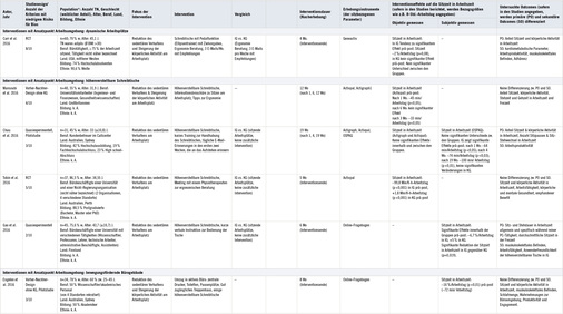 Bei reviewübergreifender Betrachtung der Ergebnisse der Einzelstudien des vorliegenden Reviews zusammen mit den Ergebnissen aus n=33 Originalarbeiten der vier aktuellsten Reviews (Becker et al. 2017; Commissaris et al. 2016; Chu et al. 2016; Shrestha et al. 2016), ergibt sich unter Anwendung der von Commissaris et al. (2016) und Hoozemans et al. (2014) beschriebenen Methodik zur Best-evidence-Synthese folgende Evidenzlage für die vier beschriebenen Interventionsansätze: