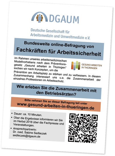 Nesseler T: Ein Kooperationsprojekt von DGAUM und BARMER. „Gesund arbeiten in Thüringen“ – Das Präventionsgesetz in der Praxis gestalten: Konzeption zu einem Modellvorhaben nach § 20 g SGB V. ASU Arbeitsmed Sozialmed Umweltmed 2017; 52: 162–165.