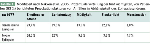 Diverse Studien zeichnen in Bezug auf die Häufigkeit der Provokationsfaktoren ein ähnliches Bild. Demnach stellen emotiona-ler Stress oder besondere psychische Belastungssituationen den häufigsten Provoka-tionsfaktor mit ca. 25–30 % dar, gefolgt von Schlafmangel bzw. Müdigkeit und fieberhaften Infekten. Bei Frauen mit Temporal-lappenepilepsien kommt eine Häufung (bis zu 28 %) im Zusammenhang mit den hormonellen Zyklusschwankungen vor. Dies wird auch als die so genannte „katameniale Anfallshäufung“ bezeichnet und tritt primär zum Zeitpunkt des Eisprungs oder dem Ein-setzten der Regelblutung auf.