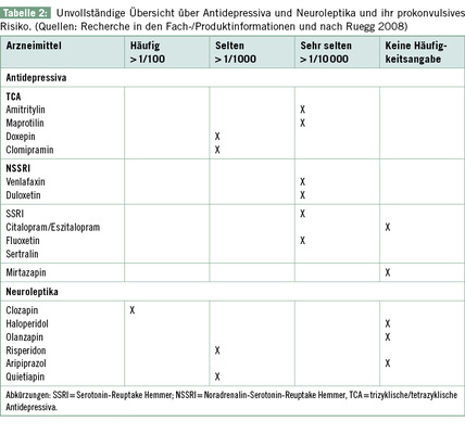 Die prokonvulsiven Eigenschaften von Neu-roleptika sind allgemein bekannt, wobei es auch in dieser Gruppe Unterschiede in der Potenz der prokonvulsiven Störwirkun-gen gibt. Insbesondere Clozapin ist davon betroffen. Danach folgen mit Abstand Haloperidol und Fluphenazin. Günstigere Eigenschaften scheinen dabei die neueren „atypischen Neuroleptika“ wie Olanzapin, Risperidon und Aripipramol zu haben. Das günstigste Profil bezüglich prokonvulsiver Eigenschaften scheint für Quietiapin zu be-stehen. Falls die Notwendigkeit einer Neuro-leptikatherapie besteht, sollte die prokonvulsive Potenz – soweit vertretbar – berücksichtigt werden (s. Tabelle 2).