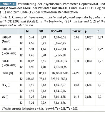 Method: 165 patients with occupational respiratory diseases (BK 4101, BK 4111) with the age of 74.2 years (SD = 7.2) participated in the study. At the beginning (T1) and at the end (T2) of the clinical stay in the clinic of occupational diseases in Falkenstein (Germany), data giving evidence about levels of depression and anxiety (BDI-II, HADS-D) were collected with the help of a questionnaire and the physical capacity was assessed using the six minute walking distance (6MWT).