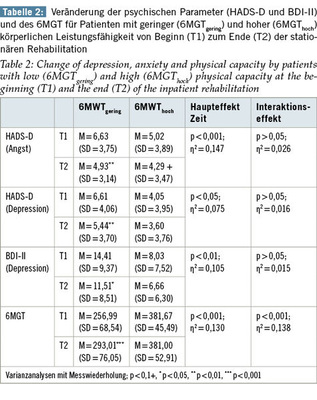 Werden nun die Teilgruppen mit einer geringen körperlichen Leistungsfähigkeit (6MGTgering) und einer höheren körperlichen Leistungsfähigkeit (6MGThoch) im Vergleich über die Rehabilitations-zeit betrachtet, dann weist Tabelle 2 aus, dass anhand von Varianzanalysen mit Messwiederholung für beide Gruppen sowohl für die psychischen als auch für die physischen Parameter signifikante Zeiteffekte zu konstatieren sind. Für den 6MGT fanden sich ebenfalls signifikante Interaktionseffekte mit einer hohen Effektstärke. Die Gruppe 6MGTgering veränderte sich von T1 zu T2 in allen Parametern signifikant im Gegensatz zur Gruppe 6MGThoch. In dieser Gruppe ergab sich eine tendenziell signifikante Veränderung der Angstwerte (p = 0,093) mit einer Reduktion um 0,73 Punkte. In der 6MGTgering-Gruppe reduzierte sich die Punktzahl sowohl für die Depressivität (BDI-II) durchschnittlich um 2,9 Punkte als auch für die Angst im Mittel um 1,7 Punkte. Weiterhin erhöhte sich in dieser Gruppe die Sechsminutengehstrecke um 36,02 m (s. Tabelle 2).