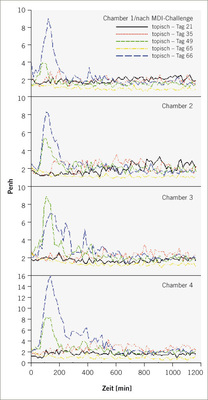 Lungenfunktionsprüfungen erfolgten an spontan atmenden Ratten in barometrischen Ganzkörperplethysmographen über ca. 20 Stunden nach inhalativer Provokation. Der Endpunkt „Penh“ hat kein humanes Korrelat, ermöglicht jedoch die nichtinvasive, kontinuierliche Erfassung der Dauer der Apnoeperiode (Pause zwischen Einatmung und Ausatmung). Damit ermöglicht Penh eine kontinuierliche indirekte Quantifizierung entzündlich-exsudativer Prozesse in der Lunge; Pauluhn 2004a). Penh erwies sich als valider Endpunkt den exakten Zeitpunkt und die Intensität verzögert auftretender Veränderungen der Lungenfunktion nach Provokation zu erfassen. Die Detektion verzögert auftretender, reversibler Atmungsreaktionen stellt ein wesentliches qualitatives Adjunkt zur Abgrenzung von allergischen und irritativen Effekte dar. Biphasische Reaktionen werden ebenfalls detektiert. Das in Abb. 2 wiedergebende Beispiel (MDI) belegt das Auftreten verzögert auftretender, transienter Lungenfunktionsveränderungen, die sich mit zunehmender Anzahl an Provokationen signifikant verstärkten. In Einklang mit der Eingangshypothese wurde nach der ersten Bronchoprovokation keine Reaktion festgestellt. Kontrolltiere wurden nicht dermal sensibilisiert aber den exakt gleichen Provokationsprotokollen unterworfen. Etwa 20 Stunden nach der letzten Provokation erfolgte eine bronchoalveoläre Lavage mit Fokus Zellzahl und Zytodifferenzierung. Neutrophile Granulozyten in der BAL erwiesen sich als differenzierende Leitparameter für die allergische Entzündung.