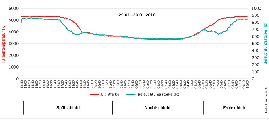 DIN-5035-7 empfiehlt eine warm- oder neutralweiße Lichtfarbe für Arbeitsstätten. Warmweiß entspricht einer Farbtemperatur unter 3300 K, neutralweiß einer Farbtemperatur von 3300–5300 K (DIN EN 12464-1, 2011). Die realisierten Farbtemperaturen liegen sowohl am Tage als auch in der Nacht in diesem Bereich (vgl. ➥ Tabelle 1). Bei Montagearbeiten soll der Farbwiedergabeindex gemäß ASR A3.4 bei 80 liegen.