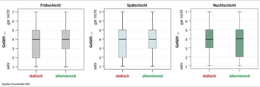 Zunächst bewerteten alle Probanden die spezifischen Beleuchtungsmerkmale (wie Lichtfarbe, Helligkeit, Farbwiedergabe, Gefallen) anhand einer siebenstufigen Skala. Hierbei waren mehrere, schichtübergreifende Antworten möglich. ➥ Abbildung 4 fasst beispielhaft die Ergebnisse für das Merkmal „Gefallen“ zusammen. Bezüglich der alternierenden und statischen Lichtbedingungen waren keine signifikanten Unterschiede im Antwortverhalten festzustellen (p >0,05). Die Übergänge von Tag- zu Nachtbedingung und umgekehrt wirkten sich nicht störend auf die befragten Beleuchtungskriterien aus. Daraus kann gefolgert werden, dass die Belegschaft das alternierende Beleuchtungssystem akzeptiert.