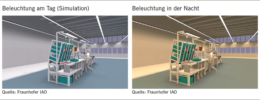 Die Fabrikhalle für die Montage pneumatischer Steuerungstechnik ist mit zwei Lichtsystemen unterschiedlicher Lichtfarbe (2-mal T16 [T5] 49 W 865 und 827 Leuchtstofflampen) in einer Höhe von 4 m ausgestattet. Diese Lichtsysteme entsprechen den einschlägigen Normen zur Beleuchtung von Arbeitsstätten. Die Beleuchtungsstärke liegt über dem in ASR A3.4 empfohlenen Wert von 500 lx für präzise Montagearbeiten.