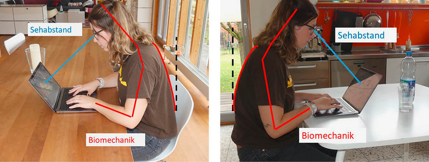 Bildschirmarbeit beinhaltet insbesondere Sehaufgaben. Um diese gut ausführen zu können, wird die Körperhaltung angepasst, das heißt, der Körper wird so ausgerichtet, dass die Zeichen auf der Bildschirmoberfläche gut zu erkennen sind. Für die Zeichengröße gibt es in der DIN EN ISO 9241-303:2009 „Ergonomie der Mensch-System-Interaktion – Anforderungen an elektronische optische Anzeigen“ Empfehlungen, abhängig vom Sehabstand. Wenn Sehabstand und Zeichengröße „zusammenpassen“, geht man bei Normalsichtigkeit von einer akzeptablen Beanspruchung der Augen aus. Das bedeutet nun aber nicht, dass auch die Körperhaltung günstig ist. In der Regel „passt“ die menschliche Anatomie beziehungsweise Biomechanik bei der Arbeit am Notebook nicht zu günstigen Sehbedingungen wie exemplarisch auf den Fotos in ➥ Abb. 2 zu sehen ist. Für die Beurteilung dieser Arbeitsweisen ist bislang kein einfach nutzbares Verfahren verfügbar. Insbesondere die Frage nach der akzeptablen Dauer dieser Arbeitsweisen ist dabei von Interesse.