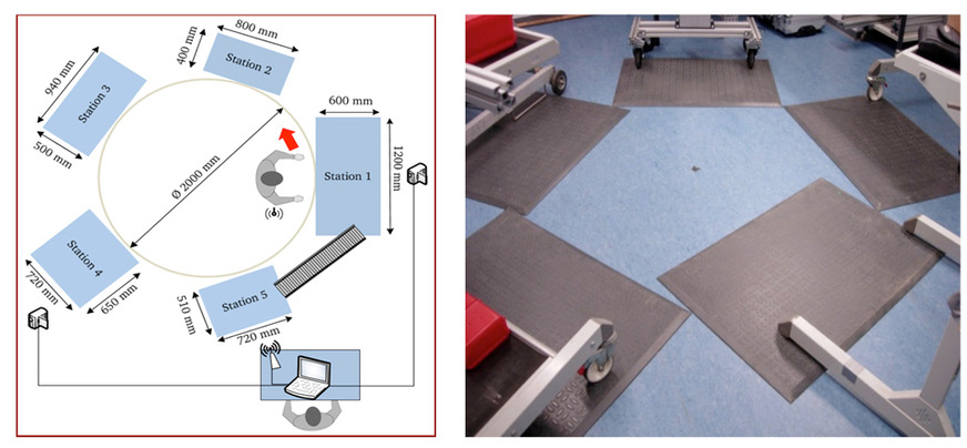 Die konzipierte und im Labor aufgebaute Montagelinie besitzt ein Kreis-Layout und ist in ihrer Gestaltung an eine in der Praxis real existierende Linie angelehnt. Die fünf Matten hatten Abmessungen von 640 × 940 mm und eine Dicke von 15 mm. Sie verfügten an der Oberfläche über ein Riffelblechdesign. An der Unterseite der Matten befand sich ein Rillenprofil. Weiterhin besaßen die Matten eine umlaufend abgeschrägte Anlaufkante (➥ Abb. 2).