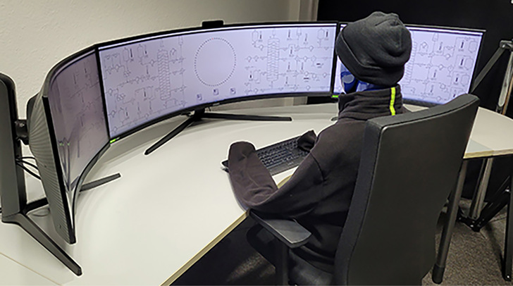 Daher wird an der Brandenburgischen Technischen Universität (BTU) zu diesem Thema geforscht. Die Studien wurden im Ergonomielabor des Fachgebiets Arbeitswissenschaft/Arbeitspsychologie (Awip) durchgeführt und erfolgten teils durch Experimentalmessungen und teils durch Einbindung von Studierenden als Versuchspersonen. Vergleichswerte lieferte eine zuvor durchgeführte Grundlagenstudie zur Informationswahrnehmung im peripheren Blickfeld bei grafisch komplexen Visualisierungsumgebungen, gefördert von der Deutschen Forschungsgemeinschaft (DFG, FKZ: HO 3993/5-1, vgl. Hoppe et al. 2022). Für diese Studie wurde ein aus fünf planaren Monitoren gebildeter Visualisierungsbogen verwendet, dessen Ausprägung durch die Nutzung von Curved-Monitoren nun perfektioniert werden konnte. Um vergleichbare Ergebnisse zu erzielen, wurde das Versuchsdesign der DFG-Studie bestmöglich nachgebildet. Im zentralen Blickfeld befand sich eine aufmerksamkeitsbindende Aufgabe, während links und rechts davon eine dynamische Prozessdarstellung mit typischen Symboliken dargeboten wurde, auf denen Reizereignisse in zufälliger Folge eingeblendet wurden. Deren Wahrnehmung sollten die Versuchspersonen ohne Seitenblicke per Tastendruck quittieren. Die Merkmale der Zielreize variierten zum Beispiel in Blickfrequenz, Kontrast und Exzentrizität. Allerdings ließen sich nicht alle Bedingungen identisch nachbilden. So konnte der Curved-Aufbau nur mit dem kleinsten handelsüblichen Radius r = 1000 mm (R1000) aufgebaut werden, während der DFG-Studie ein Radius von 766 mm zugrunde lag. Der Aufbau bestand aus einem zentral positionierten 49“-Curved-Monitor und jeweils einem 27“-Curved-Monitor vom gleichen Radius an den Seiten (➥ Abb. 1).