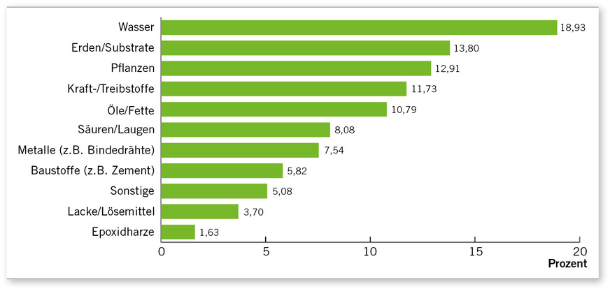 Zu den am häufigsten angegebenen Stoffen, die zu Hautveränderungen geführt haben, zählen „Wasser“, „Erden/Substrate“ sowie „Treibstoffe“ und „Öle/Fette“ (➥ Abb. 2).