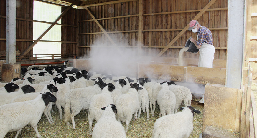 In der Tierhaltung stehen Endotoxine, Tierepithelien sowie Ammoniak und Schwefelwasserstoff im Vordergrund. Futtermittel verursachen Stäube beim Mischen, Streuen und Füttern (➥ Abb. 1). In vollmechanisierten Betrieben kann die Belastung der Beschäftigten mit gesundheitsschädigenden Stäuben und Gasen geringgehalten werden. In mittleren und kleineren Unternehmen sind die technischen, insbesondere die lüftungstechnischen, Möglichkeiten oft eingeschränkt.