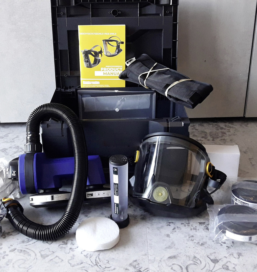 Beim SVLFG-Atemschutzverfahren erhält die betroffene Person ein hochwertiges gebläseunterstütztes Atemschutzsystem (➥ Abb. 3). Das Gerät und die dazugehörigen Gesichtsmasken wurden speziell für den Einsatz in landwirtschaftlichen Tätigkeitsbereichen, insbesondere im Stall und beim Wechsel vom Stall in den Außenbereich, getestet. Die Geräte bieten auch bei langen Arbeitseinsätzen volle Funktionalität und gleichbleibenden Tragekomfort. Die Benutzerinnen und Benutzer können unter verschiedenen Kopfteilen wählen, was die Akzeptanz erhöht. Die elektronische Steuerung des Luftstroms versorgt die Anwendenden auch bei einem sich ändernden Filterwiderstand automatisch mit Frischluft. Ein Datenspeicher zeichnet alle Nutzungsdaten auf, die für die Beratungsgespräche wertvoll sind. Das Gerät überwacht permanent den Akkuladezustand und die Filterbelegung. Bei einem unsicheren Betriebszustand warnt es akustisch. Bei Bedarf bestellen die Versicherten neue Filtereinheiten, Ersatz für defekte Gurte oder andere fehlende Materialien bei einem externen Dienstleister nach. Die Kosten für die Produkte und den Versand trägt die SVLFG (➥ Abb. 4).