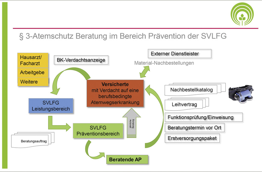 Die SVLFG unterstützt Personen, die eine Atemwegserkrankung angezeigt haben, seit vielen Jahren im Rahmen des SVLFG-Atemwegsverfahrens. Für Menschen mit einer anerkannten Berufskrankheit im Bereich der Atemwege bietet die SVLFG zukünftig IP-Maßnahmen (Individualpräventionsmaßnahmen) an. SVLFG-Präventionsfachkräfte beraten die Betroffenen bei der Auswahl und der Verwendung der passenden Atemschutzmaßnahmen. Die SVLFG stellt frischluftbetriebene Atemschutzhauben zur Verfügung. So wird in vielen Fällen erreicht, dass die Betroffenen ihre Unternehmen weiterführen beziehungsweise weiterhin an ihren angestammten Arbeitsplätzen arbeiten können.
