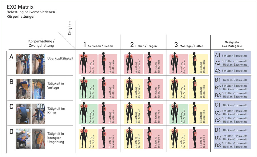 Für die Endanwender aus dem SHK-Bereich ist die farbliche Codierung jedoch eine gute Indikation, wo sich besondere Gefährdungen für die Beschäftigten ergeben könnten. Für die einzelnen Gefährdungsbereiche wurde dann aus den Feld- und Praxistests mit unterschiedlichsten Exoskeletten abgeleitet, welcher der beiden großen Teilbereiche sich für den jeweiligen Kontext eignet.