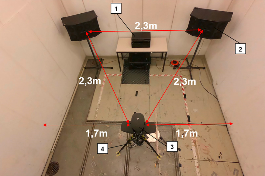 Für einen möglichen Nachweis wurden in einem „schallarmen Raum“ standardisierte Messungen durchgeführt. Um die bestmögliche Beschallung der Versuchsobjekte zu gewährleisten, wurde der in ➥ Abb. 2 gezeigte Versuchsaufbau in einem gleichschenkligen Dreieck im Raum aufgestellt. Für die Regulierung der Lautstärke und das Abspielen von Audiodateien mit zuvor aufgenommenen Realgeräuschen wurden ein Verstärker der Firma JVC vom Typ AX-Z711 sowie ein handelsüblicher CD-Player der Firma Technics SL-PG590 verwendet. Mit Hilfe beider Geräte wurden die Geräusche an zwei Lautsprecher PAB-280 der Firma Stageline übermittelt. Zur Schallaufnahme diente der Kunstkopf HSU III.2 der Firma HEAD acoustics. Ihm wurden insgesamt fünf verschiedene Kinder-Gehörschützer zur Ermittlung der jeweiligen Schalldämmung aufgesetzt. Angesichts der Nachbildung der menschlichen Ohren konnten die getesteten Gehörschützer vor jeder Messung in gleicher Position platziert werden. Für die Messung der Dämmwerte wurde der Kunstkopf mit dem Aufnahme- und Wiedergabesystem SQuadriga II der Firma HEAD acoustics verbunden. Die Auswertung der gespeicherten Daten erfolgte mit der Software ArtemiS suite 11 dieser Firma.