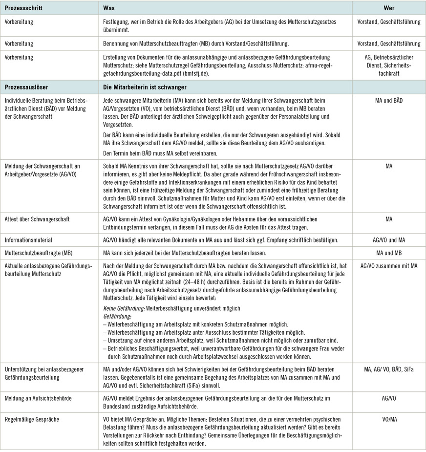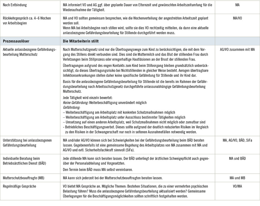 Insbesondere für größere Unternehmen empfiehlt es sich, eine oder mehrere Personen als Mutterschutzbeauftragte als niederschwellige Ansprechpersonen und Lotsinnen/Lotsen im Betrieb zu benennen sowie einen schriftlichen Prozess für die Abläufe für den Mutterschutz während der Schwangerschaft und Stillzeit niederzulegen. Bei der Prozesserstellung können die Teilnehmenden der ASA-Sitzungen den Arbeitgeber unterstützen.