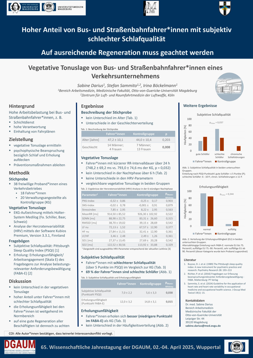 Bus and tram drivers are subject to various stresses in their work, such as shift work, adherence to timetables and a high level of responsibility towards passengers. The aim of the study is to identify the vegetative tone by means of heart rate variability (HRV) and the psychophysical state of workload in relation to recovery and sleep in bus and tram drivers, and to derive preventive measures from the results.