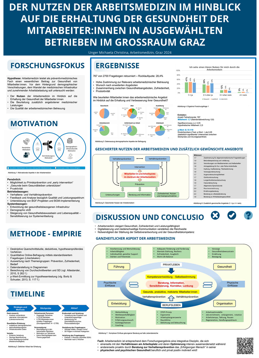 Occupational medicine plays a central role in primary prevention and the promotion of healthy working and living conditions. In the context of demographic change, skills shortages, and increasingly complex demands on the mental and physical resilience of employees, the work underlying this article examines the actual benefits of occupational health measures for maintaining employee health. Based on an empirical study in companies in the greater Graz area, the acceptance and perceived added value of