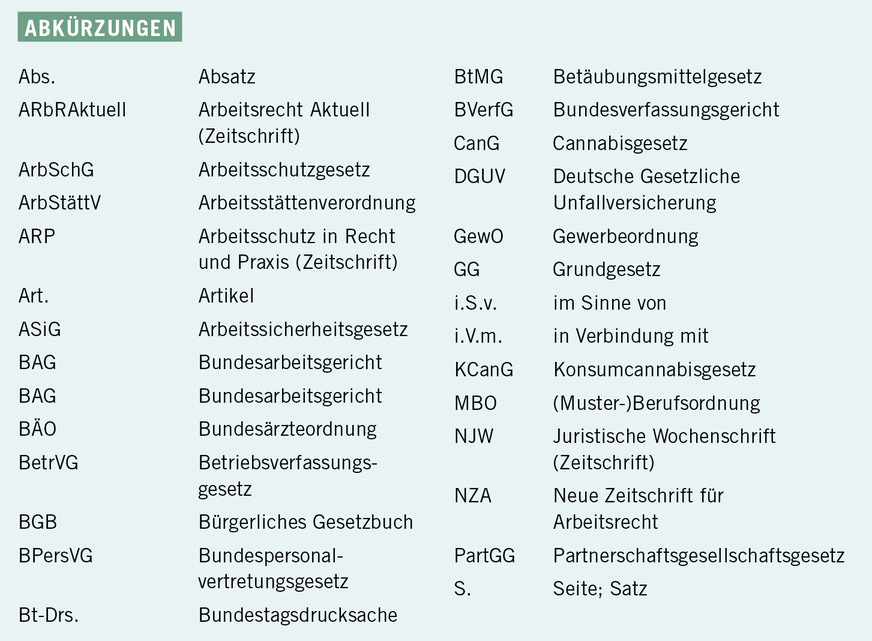 Ein entsprechendes innerbetriebliches Verbot enthält allerdings eine Problematik, die das Gebiet der Arbeitsmedizin noch lösen muss. In Bezug auf Cannabiskonsum ist noch unklar, „wann“ genau eine/ein Beschäftigte/r nicht mehr unter dem Einfluss dieser Substanz steht. Urintests auf Tetrahydrocannabinol (THC) weisen häufig nur Abbauprodukte nach. Ferner fehlen valide Grenzwerte, bei deren Überschreitung von einer Leistungsbeeinträchtigung und bei deren Unterschreitung von einem gesicherten Leistungsverhalten ausgegangen werden kann. Ebenso wenig können verlässliche Rückrechnungen erfolgen. Im Einzelfall kann es sich folglich als problematisch erweisen, wenn der Arbeitgeber darlegen und beweisen möchte, dass ein Verstoß gegen die innerbetriebliche Regelung vorliegt.