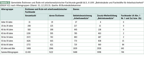 Diese Statistik erfährt eine hohe Aufmerksamkeit bei den am Arbeitsschutz be-teiligten Institutionen und Organisationen und war auch Grundlage einer Studie der Bundesanstalt für Arbeitsschutz und Arbeitsmedizin, die vom Bundesministerium für Arbeit und Soziales (BMAS) in Auftrag gegeben wurde. Erste Ergebnisse wurden auf der „Konferenz zur Sicherung des arbeitsmedizinischen Nachwuchses – Vorbeugen, Aufklären, Helfen – warum Betriebsärzte unverzichtbar sind“ des BMAS am 14. Januar 2013 bekannt gegeben. Dabei wurde deutlich, dass arbeitsmedizinischer Nachwuchs notwendig ist, um den Bedarf in den Unternehmen zu decken. Hier nun die neueste statistische Erhebung.