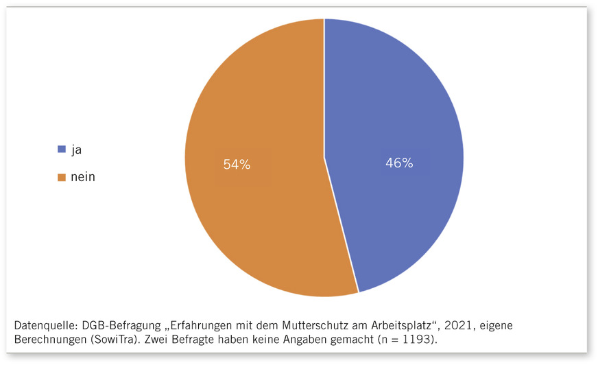 Vieles deutet also darauf hin, dass in der praktischen Umsetzung des Mutterschutzes eines der zentralen Instrumente des Arbeitsschutzes – die Gefährdungsbeurteilung – nicht funktioniert. Besorgniserregend ist darüber hinaus, dass das in diesem Zusammenhang gesetzlich vorgeschriebene Gespräch nicht einmal der Hälfte der Befragten (46 %) angeboten wurde (➥ Abb. 3).