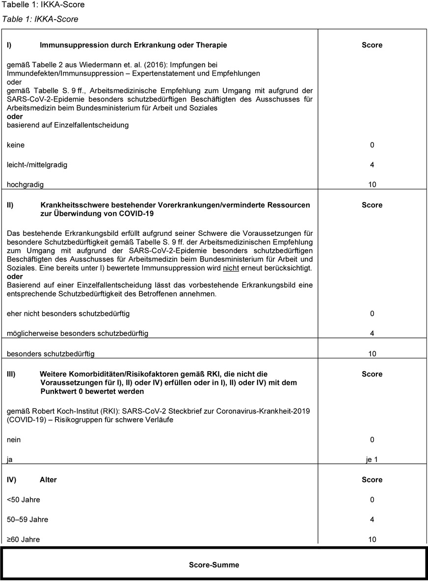 Schlussfolgerung: Mit dem IKKA-Score wird Ärztinnen und Ärzten eine Entscheidungshilfe für die Beurteilung des individuellen Risikos durch SARS-CoV-2 zur Verfügung gestellt. Die Stärke des IKKA-Scores liegt in der Vereinheitlichung der Risikobeurteilung unter möglichst großer Übersichtlichkeit und geringem Zeitaufwand sowie in der Berücksichtigung bereits existenter Empfehlungen des Bundesministeriums für Arbeit und Soziales (BMAS).