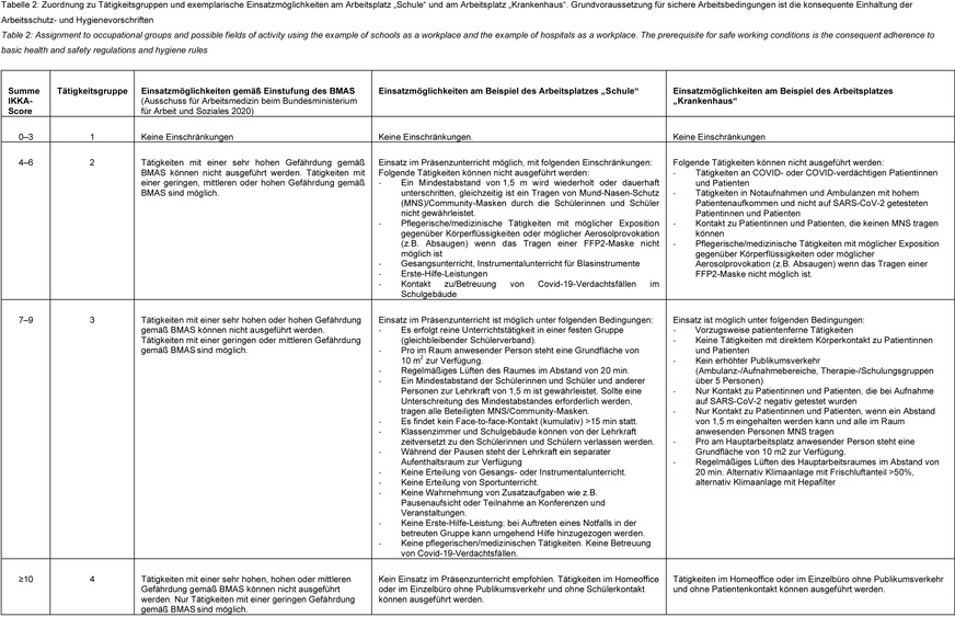 Results: The IKKA-Score is composed of four categories: Immunosuppression (I), Known severity of any pre-existing condition (II), Known risk factors as defined by the Robert Koch Institute (RKI) (III), and Age (IV). Within each of the categories a score is allotted by the physician depending on the extent of the respective risk factors. The final score results from the sum of the individual scores in each category. On the basis of the final score the employee is assigned to one of four occupational groups. Employers can specify possible fields of activity for members of each group on the basis of the company’s risk assessment. Table 2 presents the assignment to occupational groups and possible fields of activity using the examples of schools and hospitals as a workplace.