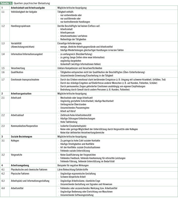 Für die betriebliche Prävention psychi-scher Gefährdungen muss an den im Betrieb vorhandenen (und beeinflussbaren) Quellen angesetzt werden. In der gemeinsamen Er-klärung „Psychische Gesundheit in der Ar-beitswelt“ des Bundesministeriums für Arbeit und Soziales (BMAS), der Bundesvereinigung der Deutschen Arbeitgeberverbände (BDA) sowie dem Deutschen Gewerkschaftsbund (DGB) werden die (betrieblichen) Quellen verschiedener psychischer Belastungen aufgeführt ( Tabelle 1 ).