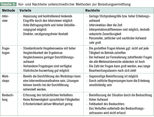 Es besteht das methodische Problem der Beurteilung psychischer Belastungen. Messverfahren wie z. B. bei der Lärmmessung oder anerkannte orientierende Bewertungsverfahren wie z. B. die Leitmerkmalmethode zur Beurteilung von Hebe- und Tragetätigkeiten liegen nicht oder nur auf Expertenniveau vor. Methodisch wichtig ist es, dass die Belastungen ermittelt werden und nicht die Wirkungen, d. h. die Beanspruchungsfolgen (s. „Weitere Infos“: IAG-Report „Ge-fährdungsbeurteilung psychischer Belas-tungen“). Hierzu gibt es unterschiedliche methodische Herangehensweisen die in Tabelle 2 mit ausgewählten Vor- und Nachteilen zusammengestellt sind. Oft ist es günstig, wenn die einzelnen Methoden mittels externer Unterstützung im Betrieb angewandt werden.