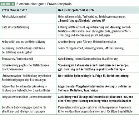 Auf der Grundlage umfangreicher, interdisziplinärer Forschung (siehe Folge 4) lassen sich „Elemente einer guten Präventionspraxis“ zum Erhalt und zur Förderung der psychischen Gesundheit von Beschäftigten ableiten, deren Realisierbarkeit auf Unternehmensebene zu prüfen ist ( Tabelle 1 ). Einige dieser Realisierungsempfehlungen können allein oder maßgeblich vom Betriebsarzt gestaltet, abgestimmt und umgesetzt werden (Fettdruck). Die übrigen Ansätze – Führung und Entwicklung der Arbeitsbeziehungen – unterliegen der personalpolitischen Gestaltung und komplexen betrieblichen Entscheidungsprozessen.