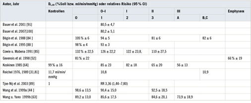Einige der hier berücksichtigten Publikationen sind älteren Datums und haben gewisse Schwächen. Dies betrifft die mangelhafte Definition der untersuchten Kollektive ebenso wie die fehlende Publikation der Streuung der Daten. Auch sind die funktionellen Befunde nicht einheitlich auf die (gleichen) Lungenfunktionssollwerte bezogen worden. Statistische Angaben fehlen oft. Da die Ergebnisse der Studien trotz ihrer methodischen Schwächen weitgehend widerspruchsfrei sind, erschien eine Einbeziehung dennoch gerechtfertigt.