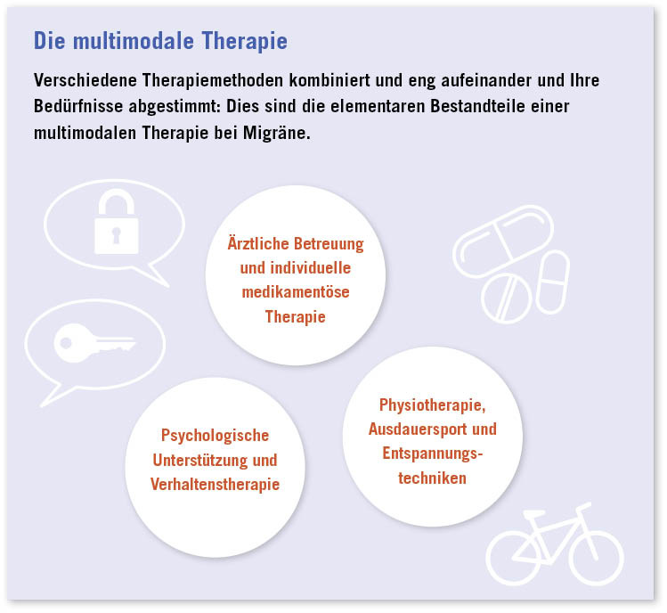 Die bestmögliche Therapie von Migränepatienten beginnt damit, die Erkrankung zu erkennen und zu diagnostizieren. Daher ist es wichtig, sich intensiv mit dem Thema auseinanderzusetzen. Für eine erfolgreiche Behandlung von Migränepatienten wird neben der Gabe von Medikamenten zur sogenannten multimodalen Therapieform geraten, in der verschiedene, auch nichtmedikamentöse Therapiemethoden miteinander kombiniert werden können.