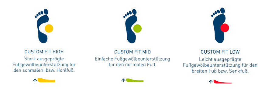 Je nach individueller Fußform kann also die passende Einlegesohle gewählt und dadurch der Tragekomfort optimiert werden. Bei starken Fehlstellungen sollte allerdings stets ein Orthopäde aufgesucht werden und ggf. DGUV 112-191 zertifizierte Sicherheitsschuhe getragen werden, die die Einlage individuell orthopädisch angefertigter Einlegesohlen zulassen.