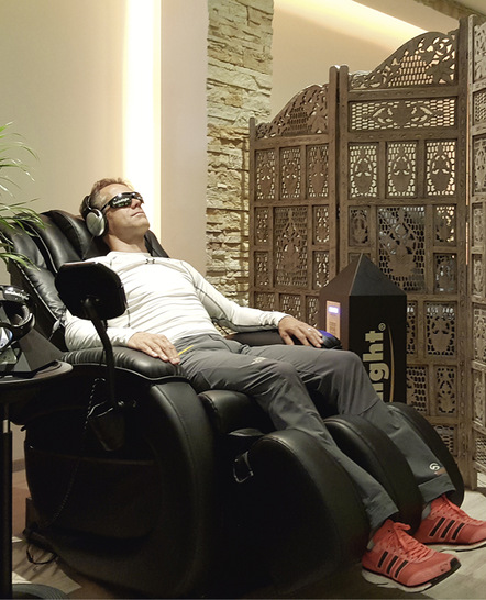 Wie dürfen Interessierte sich eine brainLight-Anwendung vorstellen? Zunächst einmal setzen sie für eine Entspannung auf dem brainLight-Komplettsystem Visualisierungsbrille und Kopfhörer auf. Über Impulse der LED-Dioden im Innenteil der Brille und akustische Stimuli, die sie über den Kopfhörer wahrnehmen, werden Anwendende in die Entspannung geführt. Das Gehirn kann sich diesen vorgegebenen Stimuli anpassen und sinkt tiefenentspannt in eine wunderbar ausbalancierte Konstitution. Je nach Programm können Sprache und Musik das Relax-Erlebnis verstärken, die auch über den Kopfhörer eingespielt werden.