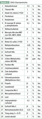 Die Deutsche Dermatologische Gesellschaft hat eine Leitlinie für die Durchführung des Epikutantests mit Kontaktallergenen erarbeitet (AWMF 2007). Derzeit wird in Kooperation u. a. mit der DGAUM eine S3-Leitlinie zu dieser Thematik erarbeitet. Die Deutsche Kontaktallergiegruppe (DKG) ermittelt die jeweils 20 häufigsten Allergene, die in der sog. Standardreihe getestet werden ( Tabelle 2 ). Daneben gibt es Spezialreihen mit beruflichen Allergenen (siehe Info).