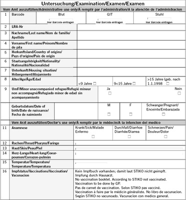 In der Folgezeit wurde das ärztliche Erstscreening bei jedem Asylsuchenden standardisiert durchgeführt. Im Mittelpunkt dieses Screenings standen gemäß den gesetzlichen Vorgaben primär die Identifikation potenziell übertragbarer Krankheiten der Haut, der Lunge und des Magen-Darm-Trakts bzw. die Diagnose und Therapie von relevanten Akutkrankheiten mit bestehender Schmerzsymptomatik. Den standardisierten Protokollbogen dieses Erstscreenings gibt Abb. 2 wieder.