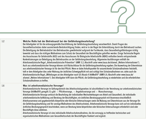 Den AfAMed erreichen immer wieder Anfragen zur arbeitsmedizinischen Prävention aus der Praxis. Der AfAMed begrüßt diese Interaktion mit den Anwendern der ArbMedVV und den Experten des Arbeitsschutzes sehr. Um relevante Fragen und deren Beantwortung der allgemeinen Öffentlichkeit zu Verfügung zu stellen, publiziert der AfAMed häufig gestellte Fragen und Antworten (FAQ) auf seiner Homepage (s. „Weitere Infos“). Prinzipiell sind die FAQs derzeit in drei Kapitel unterteilt
